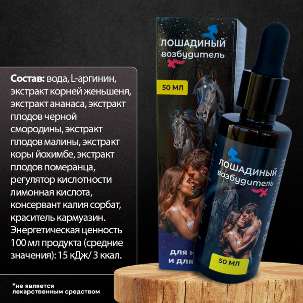 "Лошадиный возбудитель" - возбуждающие капли для двоих, которые воздействуют на организм мужчины и женщины, тонизируют и пробуждают чувственность, усиливают чувствительность во время полового акта. Компоненты препарата вызывают мощное возбуждение и усиливают влечение к противоположному полу. Помимо этого, средство позволяет получить больше удовольствия от секса!